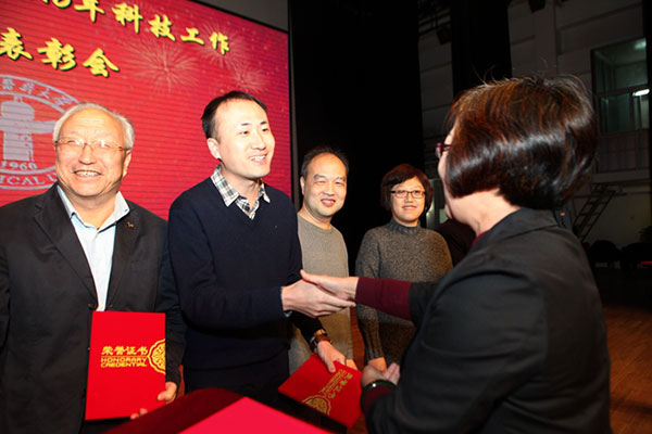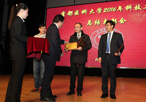 首医大副校长王晓民主持会议,并对2016年首医系统科技工作进行了总结报告。我院获得科研项目管理奖、科研论文管理奖,刘亚欧等多人获得SCI 论文奖励。校党委书记李明颁奖。