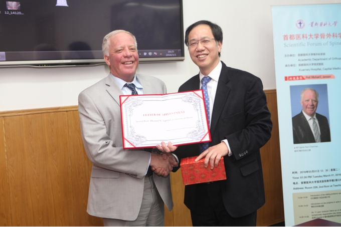 2016年3月1日,首都医科大学骨外科学系脊柱外科研讨会在我院召开,本次会议由首都医科大学宣武医院骨科承办,会议邀请到前AO脊柱协会主席、著名的脊柱外科专家Michael E. Janssen教授进行学术交流。来访期间,Janssen教授进行了专业的手术指导,在随后举行的学术交流会上,Janssen教授就颈椎及腰椎退行性疾病的相关内容做了精彩的学术报告,详细讲解了腰椎间盘置换手术的适应症、禁忌症及相关的并发症,并就手术技术进行了深入的讲解。来自骨科学系十多家单位的五十余名同道参加了会议,与会人员就骨科脊柱领域的相关问题与Janssen教授进行了广泛的交流与探讨。Janssen教授针对我院骨科脊柱相关疾病的诊疗工作做了深入的指导,并给予充分的肯定。